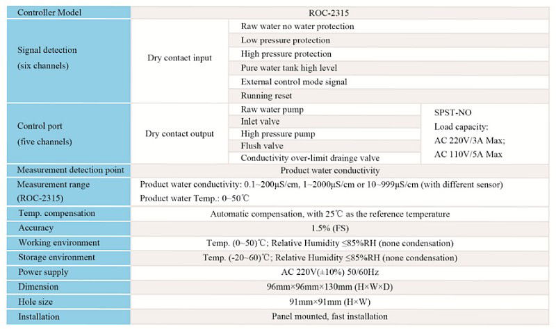 Description Technique : Contrôleur ROC 2315 Aperçu du Produit Le ROC 2315 est un contrôleur de pointe conçu pour la gestion automatique des unités d'osmose inverse à un étage. Il combine en un seul boîtier un conductivimètre de précision et un automate programmable. Sa particularité réside dans sa capacité à gérer des logiques de fonctionnement complexes, assurant une protection maximale des membranes et des pompes haute pression. Fonctionnalités Avancées Double Mesure de Conductivité : Capacité (selon configuration) de surveiller la qualité de l'eau brute et de l'eau produite pour calculer le taux de rejet. Interface Utilisateur Améliorée : Écran LCD avec affichage des états de fonctionnement (Production, Rinçage, Alarme, Veille). Entrées de Sécurité Multiples : Surveillance du manque d'eau (BP), de l'excès de pression (HP), du niveau du réservoir et des pré-traitements. Compensation de Température : Analyse automatique pour une mesure de conductivité précise, même si la température de l'eau varie.